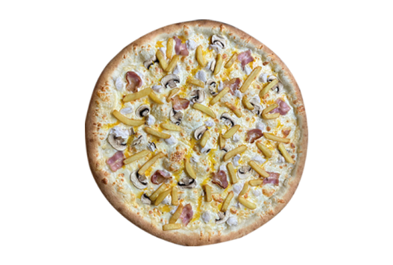 Сливочный соус, моцарелла, соус горчичный, соус чесночный, курица, шампиньоны, бекон, красный лук, картофель